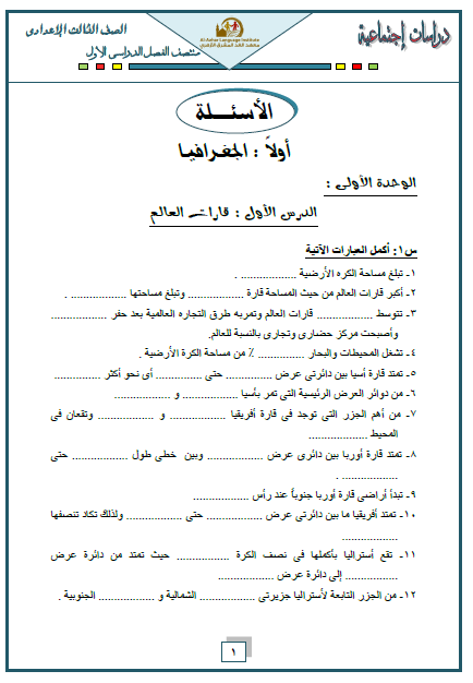 اسئلة دراسات للصف الاول الاعدادى الترم الاول جغرافيا