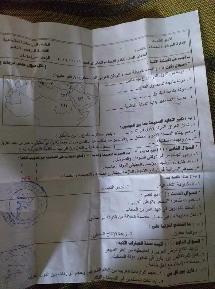 امتحان الدراسات الاجتماعية للصف الثاني الإعدادي ترم ثاني 2019 منطقة الدقهلية الأزهرية