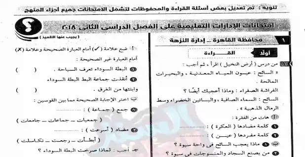 نماذج امتحانات المحافظات في اللغة العربية للصف الثالث الابتدائي الترم الثاني 2017
