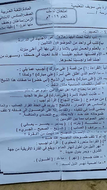 امتحان اللغة العربية للصف السادس الابتدائي ترم أول 2019 ادارة بنى سويف التعليمية