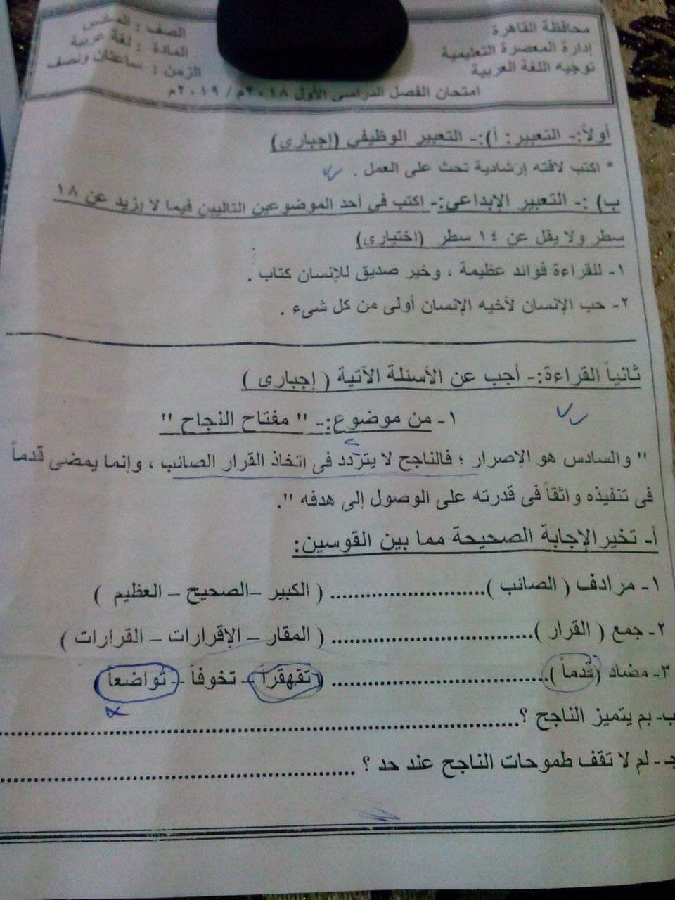 ورقة امتحان اللغة العربية للصف السادس الابتدائي الترم الاول 2019 ادارة ههيا التعليمية محافظة الشرقية