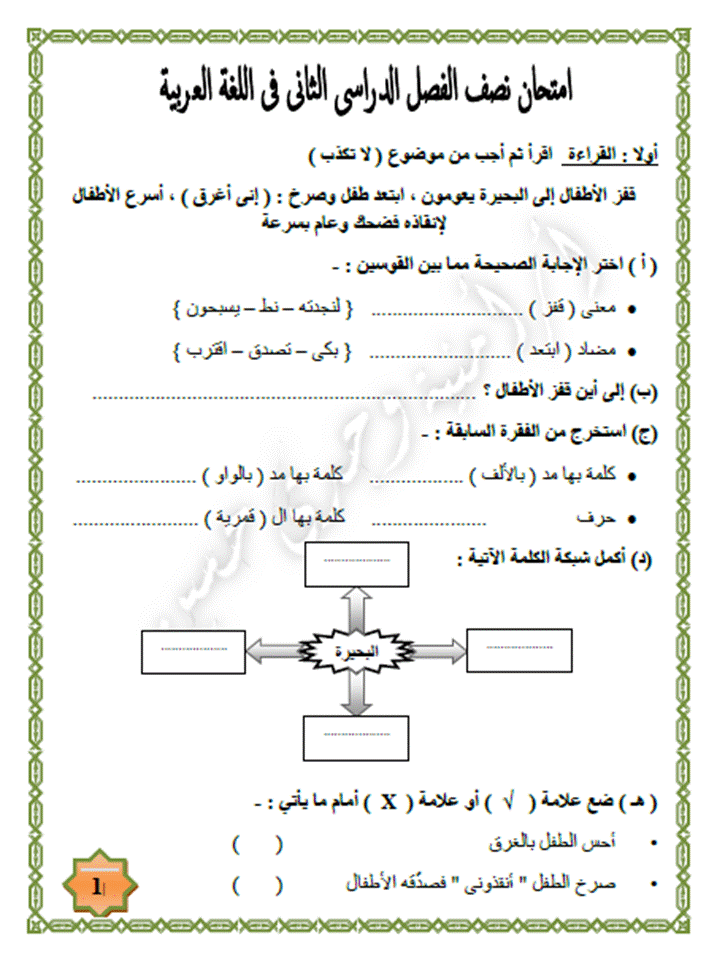 امتحان نصف الفصل الدراسى الثانى فى اللغة العربية للصف الثانى الابتدائى 2016
