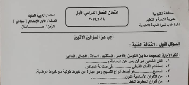 امتحان التربية الفنية للصف الاول الاعدادي نصف العام 2018 ادارة غرب شبرا القليوبية