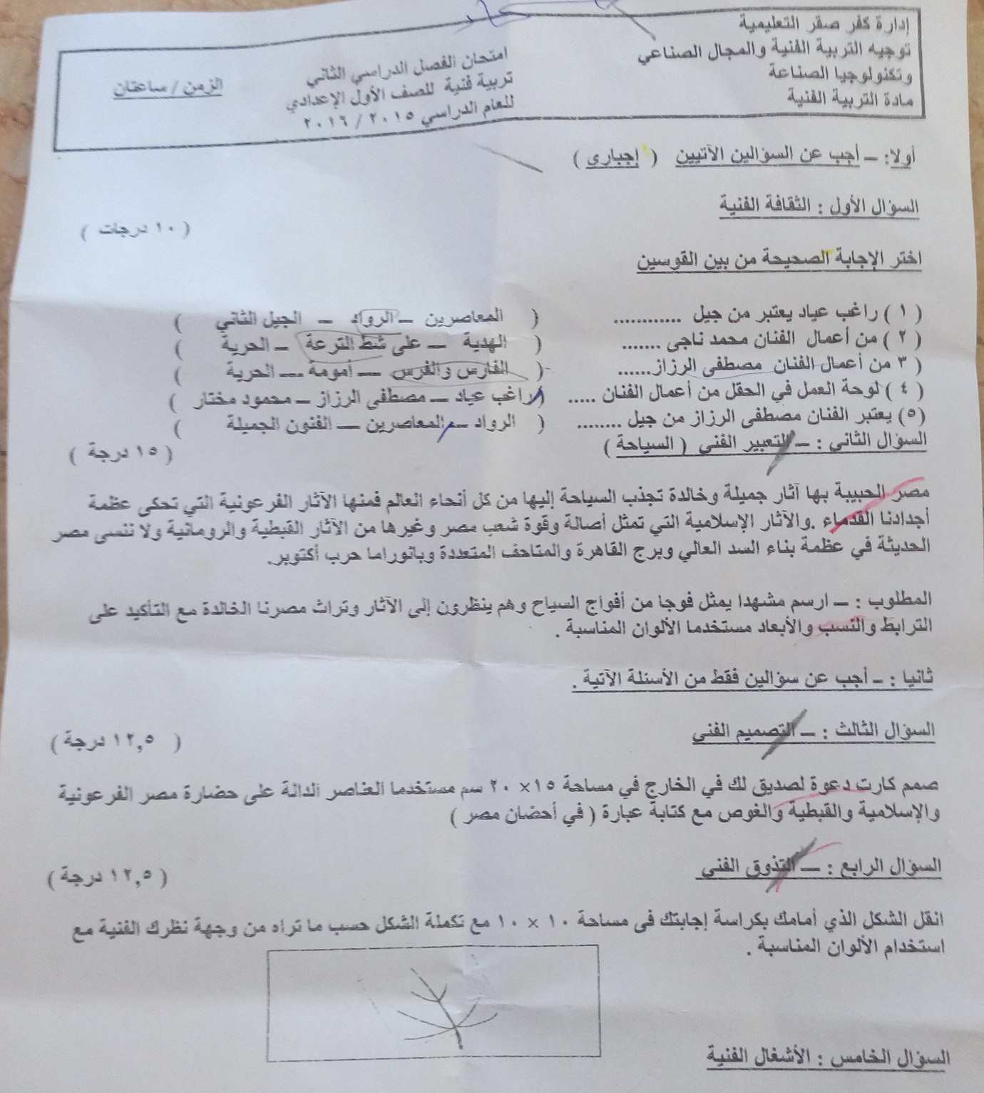 ورقة امتحان التربية الفنية للصف الاول الاعدادى الادارة كفر صقر التعليمية الترم الثانى 2016 محافظة الشرقية