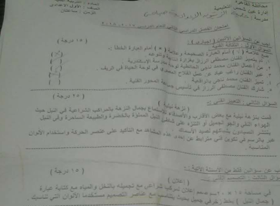 امتحان التربية الفنية للصف الاول الاعدادى ترم ثانى 2018 ادارة البساتين ودار السلام التعليمية محافظة القاهرة تم امتحانة فعلا Art Education First Grade Exam