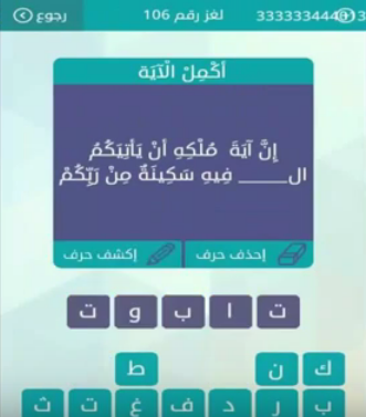 حل لغز ان اية ملكه ان ياتيكم ال فيه سكينة من ربكم من لعبة وصلة لغز رقم 106 للمجموعة الثانية عش صقور الإبدآع