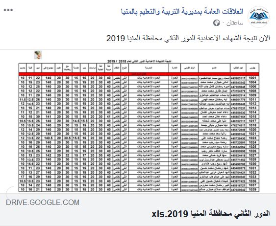 ظهرت نتيجة الشهادة الاعدادية محافظة المنيا الترم الثاني بالأسم ورقم الجلوس جميع القطاعات قطاع شمال العدوة مغاغة بني مزار قطاع وسط مطاي سمالوط المنيا قطاع جنوب أبو قرقاص ملوي ديرمواس ملف اكسيل Xls