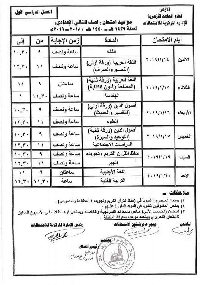 جدول امتحانات نصف العام 2019 الصف الثانى الإعدادي الازهرى امتحانات الترم الأول في جميع المعاهد الأزهرية المرحلة الابتدائية الإعدادية الثانوية قطاع المعاهد الأزهرية جريدة الفراعنة