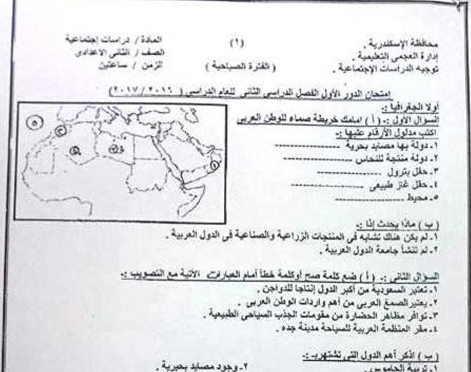 ورقة امتحان الدراسات الاجتماعية للثانى الاعدادى ترم ثانى 2017 تم امتحانة فعلا لادارة العجمى التعليمية