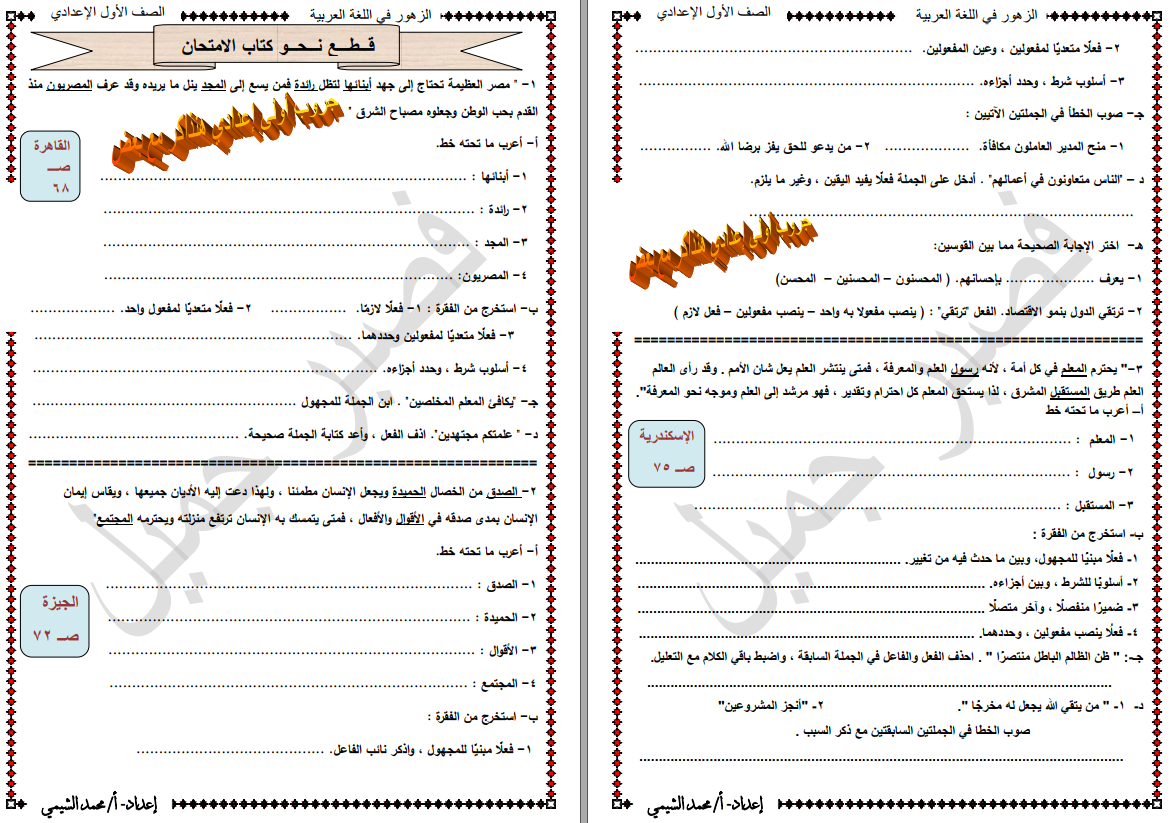 مذكرة تدريبات نحوية للصف الاول الأعدادى الترم الاول