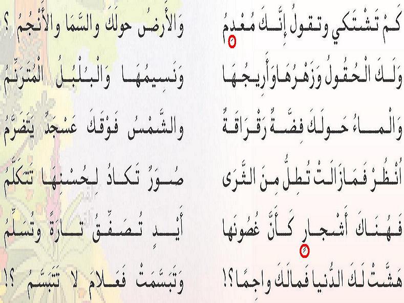 كم تشتكي وتقول أنك معدم والأرض ملكك والسما والأنجم إيليا أبو ماضي حكم