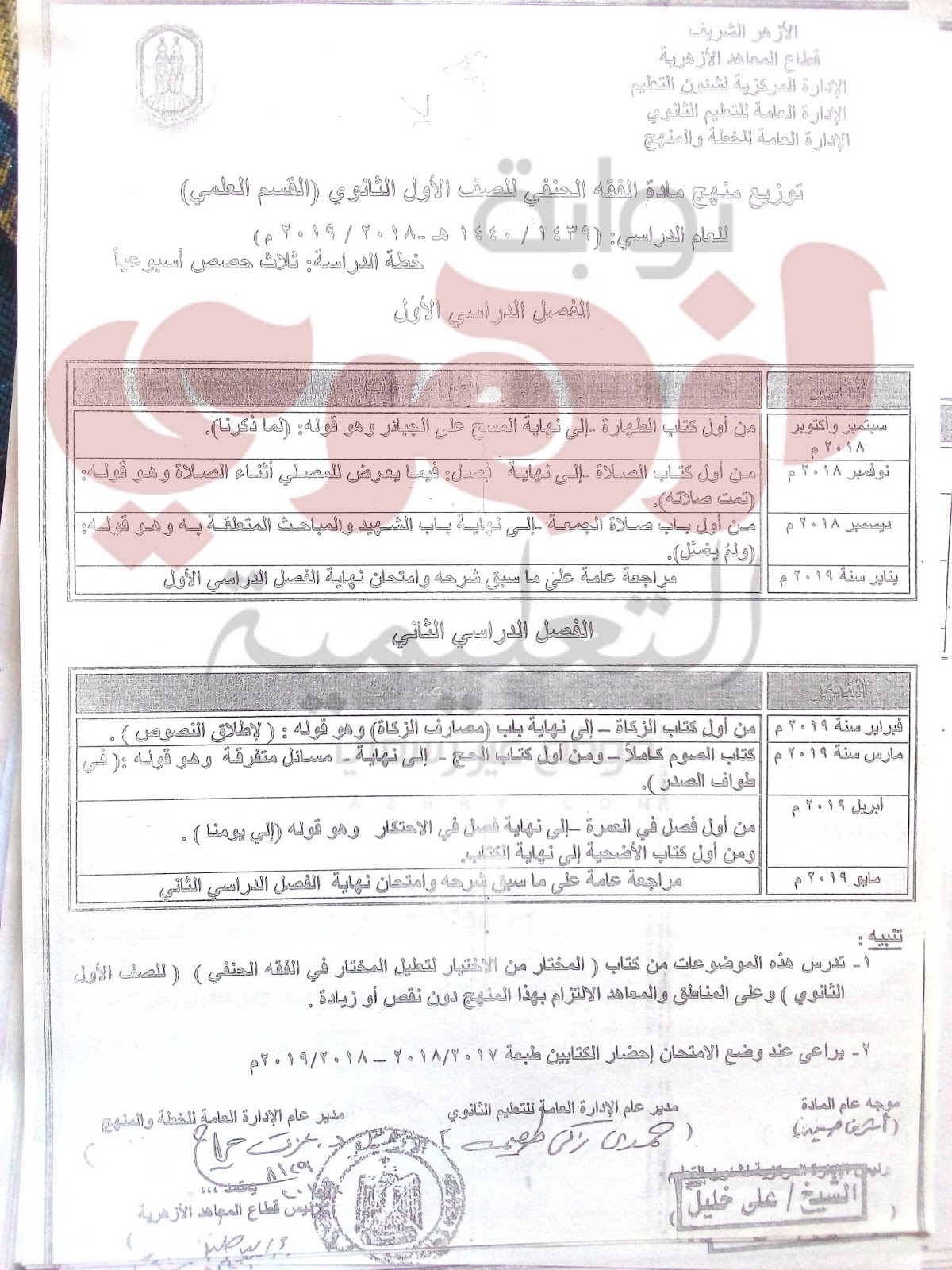 توزيع مناهج الاول الثانوي علمي الازهري لعام 2019