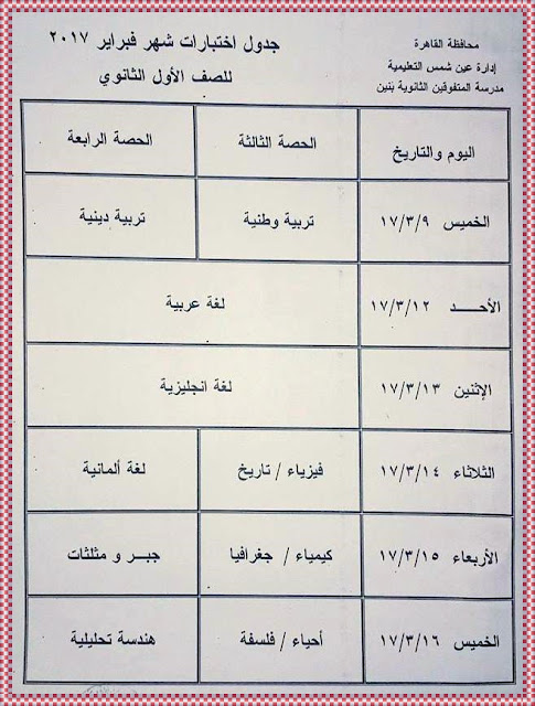 مدرسة المتفوقين الثانوية بعين شمس جدول امتحان شهر فبراير 2017 للصفين الأول والثانى