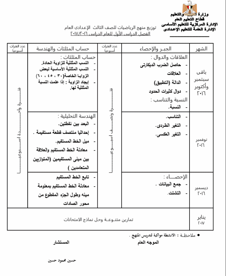 توزيع منهج الرياضيات للصف الثالث الاعدادى الترم الاول 2017 وزارة التربية والتعليم ماجيك تكنولوجي