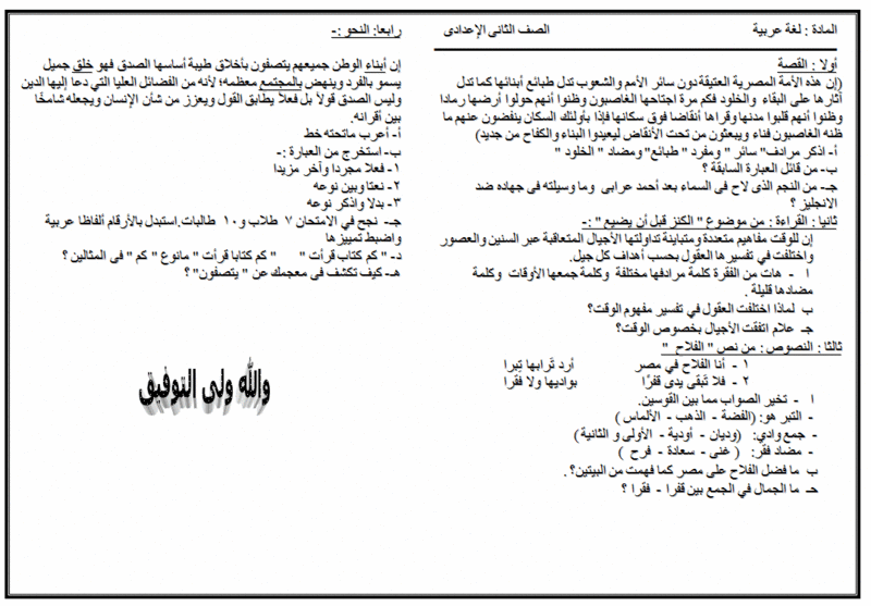 امتحان نصف الترم فى مادة اللغة العربية الصف الثاني الاعدادي الترم الثاني امتحان ميد تيرم فى