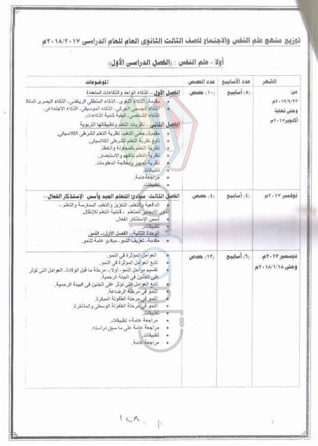 توزيع منهج علم النفس والاجتماع للثانوية العامة 2018